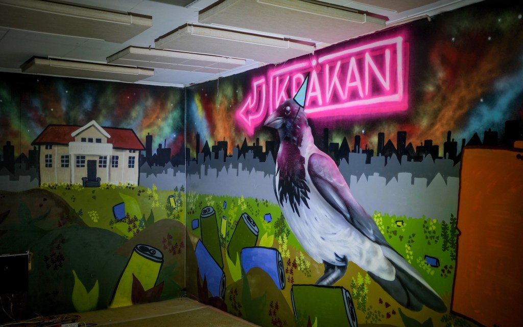 Att arbeta i en sådan skön lokal var en ren fröjd. Den öppna planlösningen och de stora fönstren bidrog till en ljus och inbjudande miljö, vilket gjorde att målarjobbet kändes både enkelt och roligt. Jag arbetade noggrant för att se till att varje detalj, från kråkans eleganta former till de glittrande neonskyltarna, blev exakt som vi hade föreställt oss.