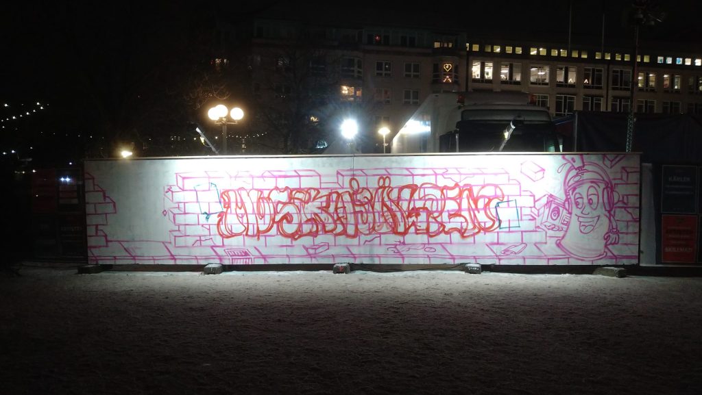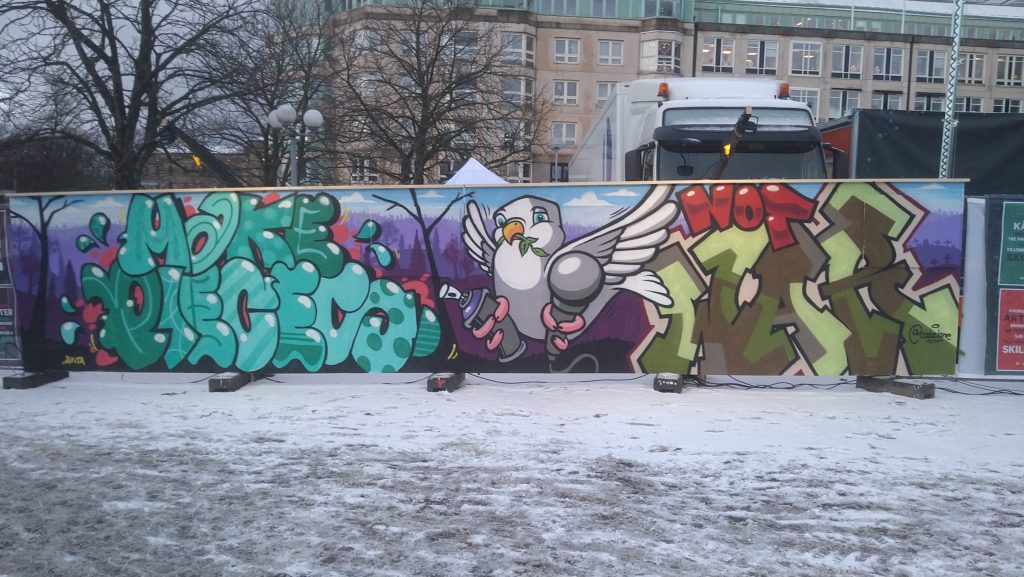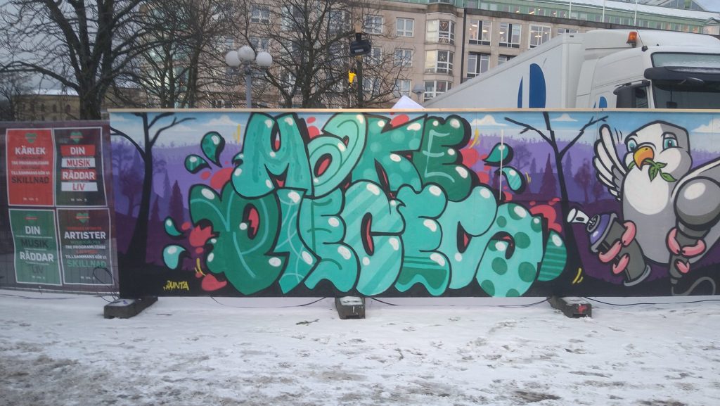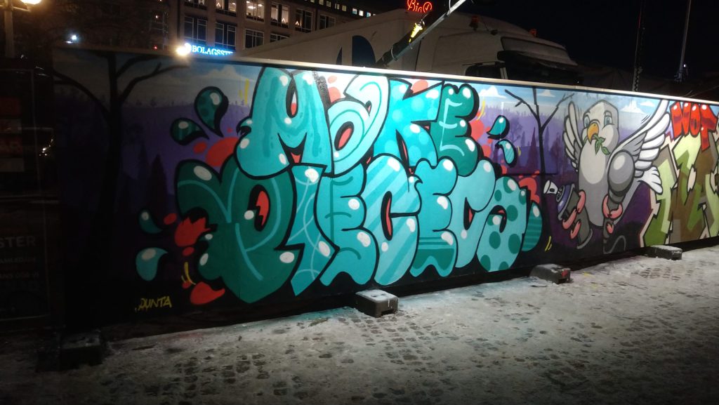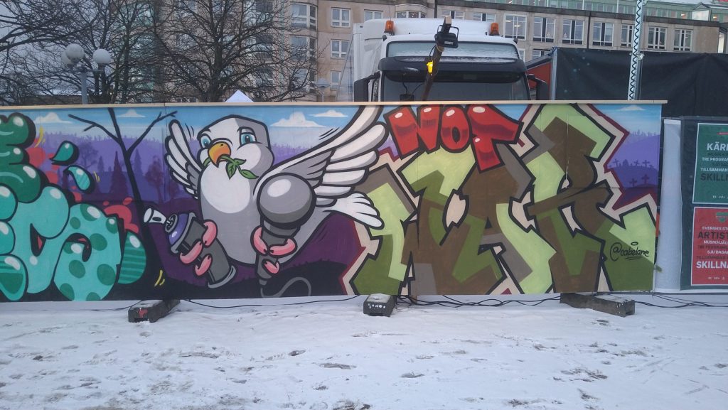 Förutom budskapet så målades även en fredsduva men en sprayburk och en mikrofon i vardera klo för att knyta samma konceptet. Trots kyla och svåra förhållande så gick målandet bra och vi lämnade väggen efter första dagen nöjda och belåtna med vad som hade skapats.