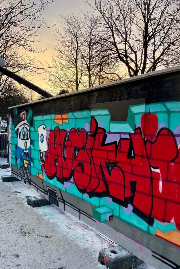 Målningen illustrerade en mur med en graffititext: Muiskhjälpen med tillhörande characters bestående av en sprayburk som lyssnade på musik och en spårvagn som körde rätt igenom ”muren”. Tanken bakom detta var att med musiken och graffitins hjälp så river man murarna och raderar ut de gränser som skiljer oss människor åt, På flykt skall det inte finnas några gränser eller murar helt enkelt. Väl vid väggen så kände man också av kylan markant då sprayen spottade ut färgen och vissa burkar slutade fungera helt. Trots detta kämpade vi oss igenom det hela och strax efter solen gått ner så hade vi lyckats färdigställa motivet för dagen.