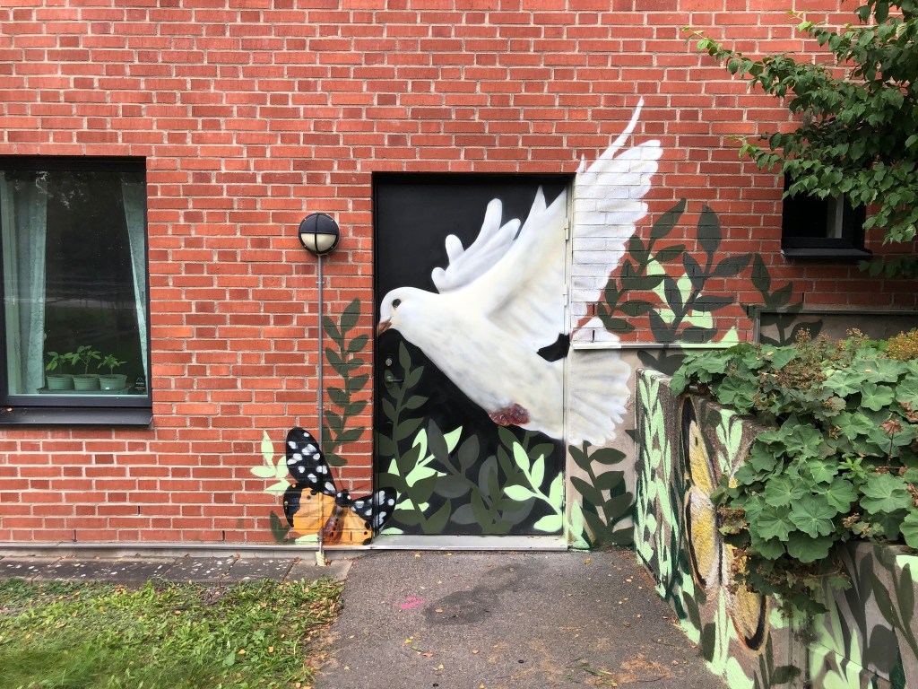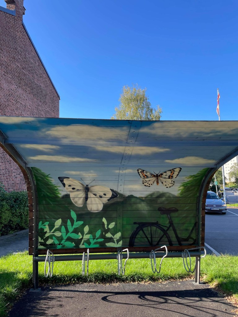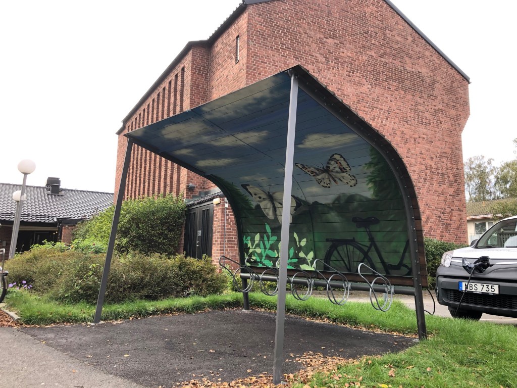 Första är på husfasaden som är mot spårvagnen och torget, den andra är på deras nybyggda cykelställ.