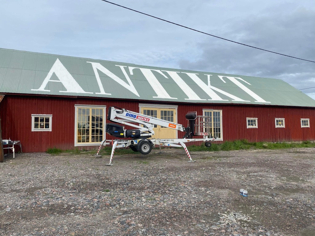Vi skulle på taket skriva texten ANTIKT med stora vita bokstäver.