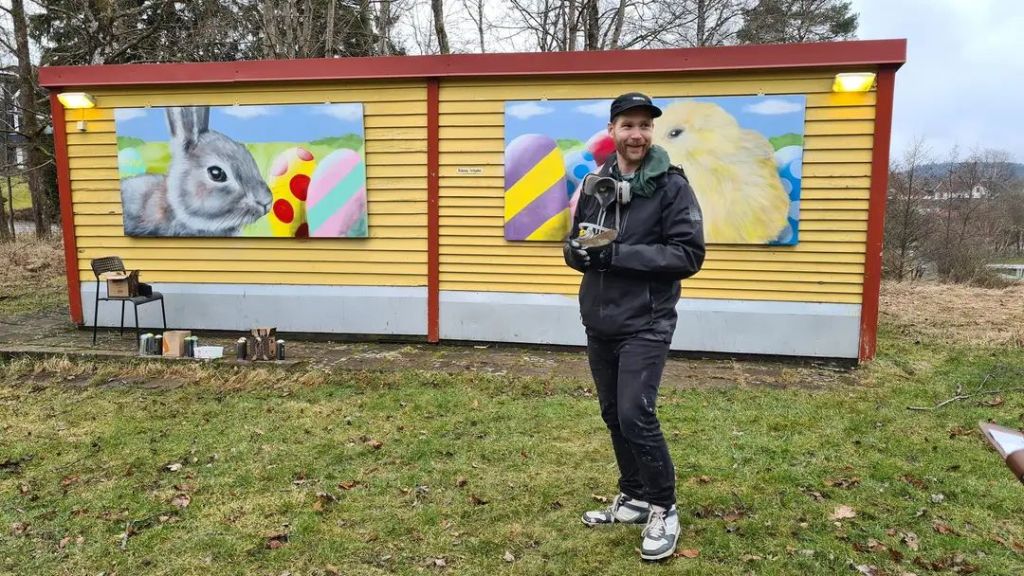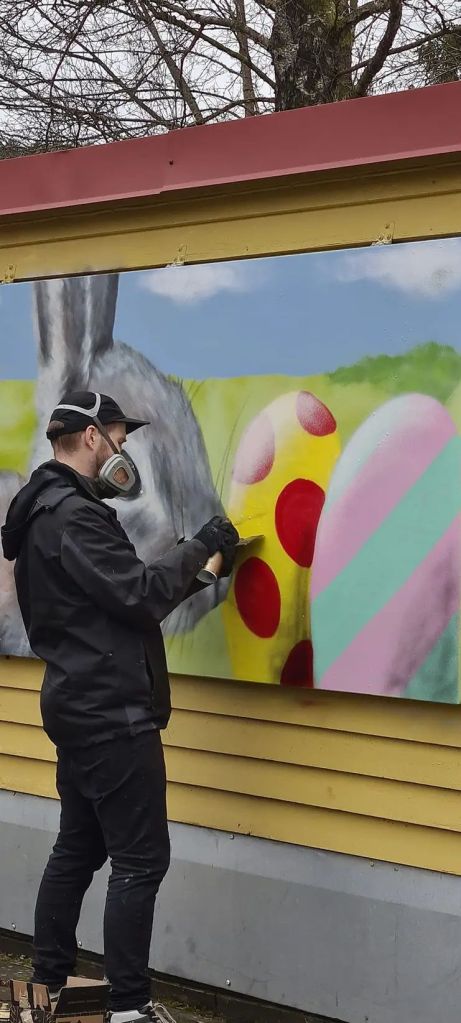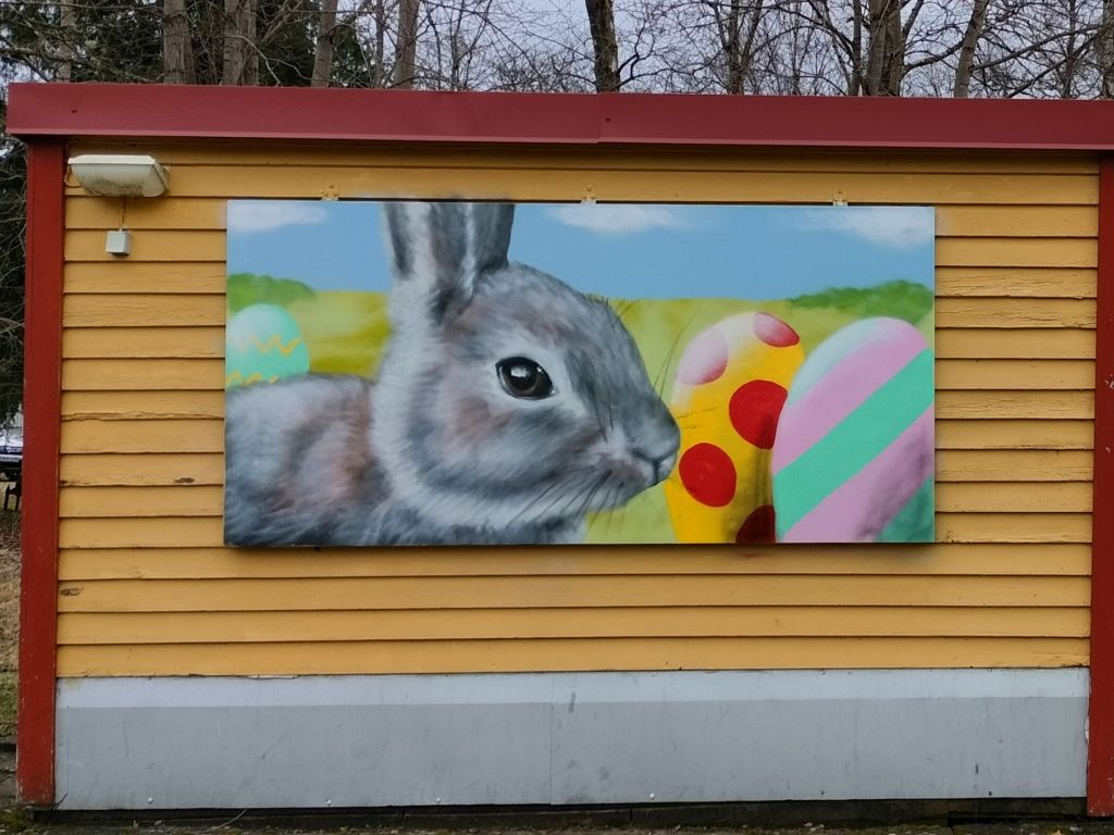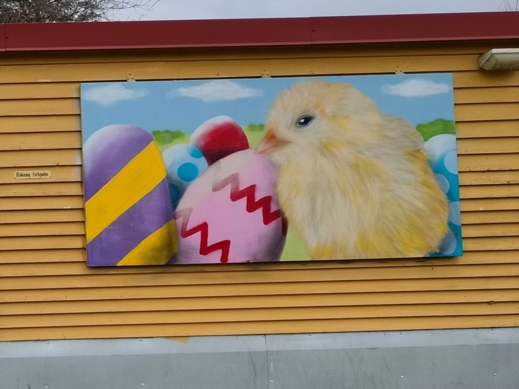 Nu är årets påskmålning färdig på Viljans Park. På den tvådelade väggen blev det en kanin på ena luckan och en kyckling på den andra.