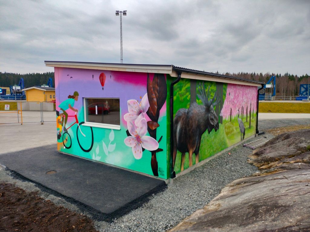 Ett stort och kul jobb. Har dessvärre haft otur med vädret. Varit två veckor kantade med regn och rusk, men emellan alla skurar har man sett solen skina och sprayen har kunnat appliceras på väggen.