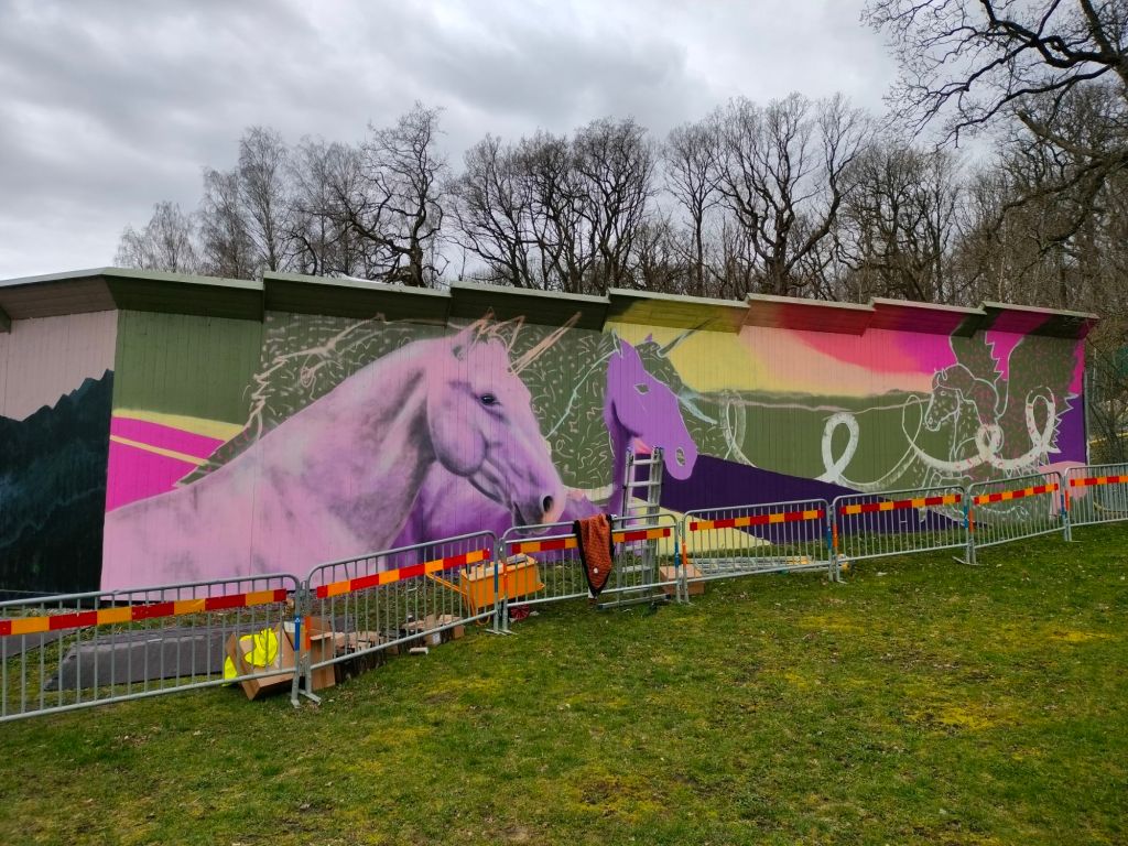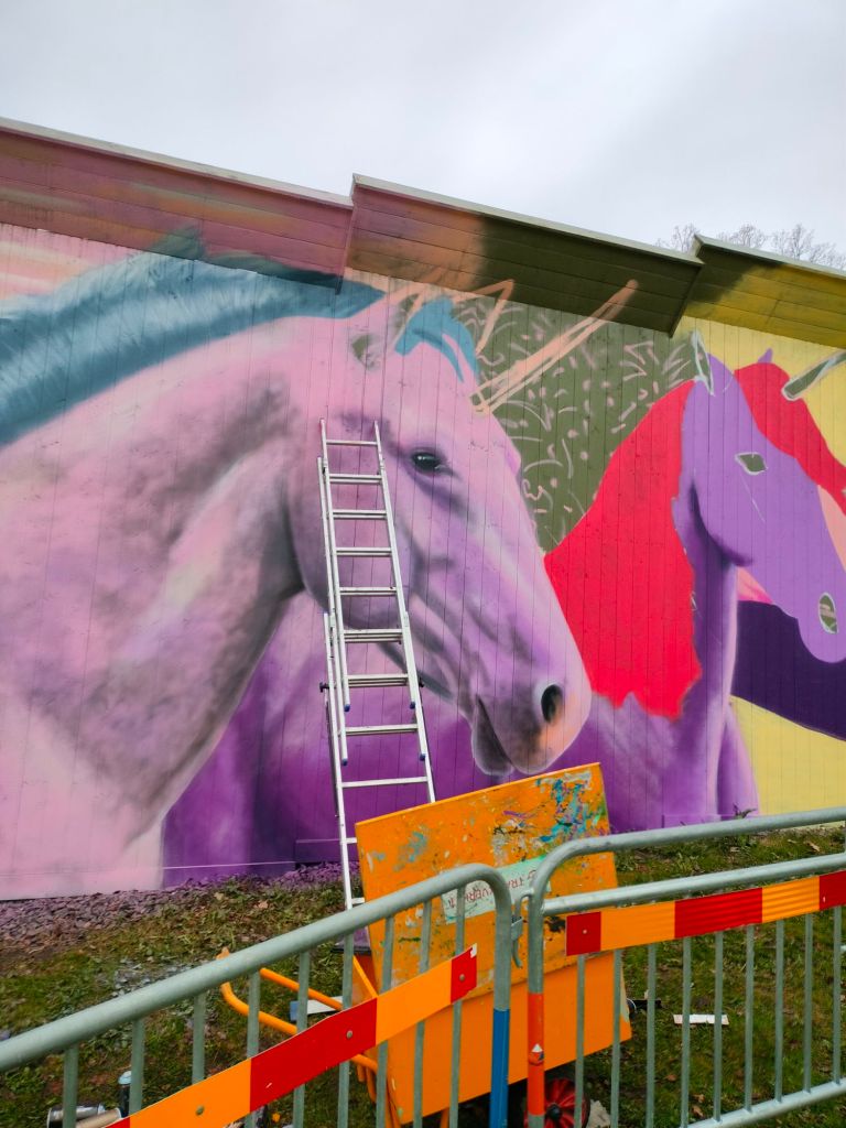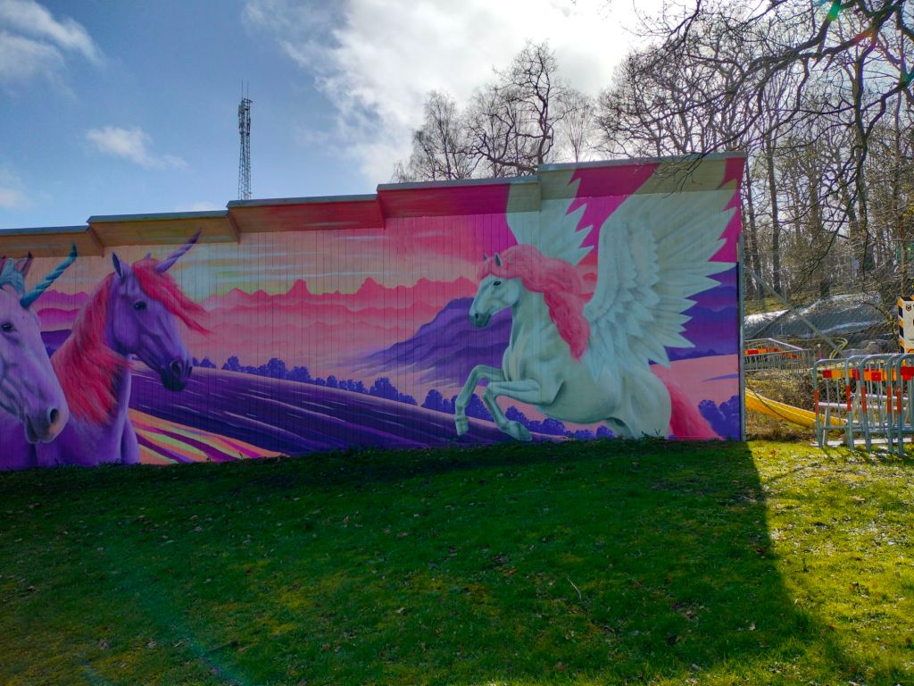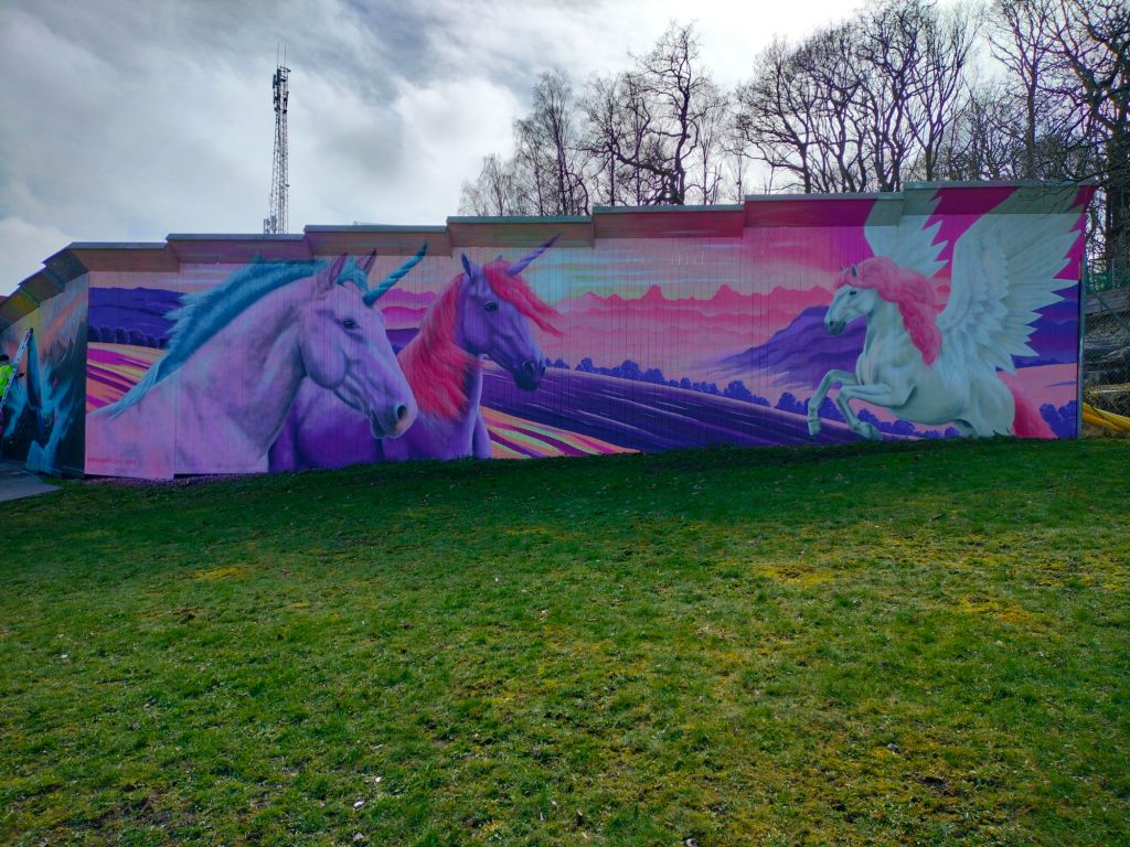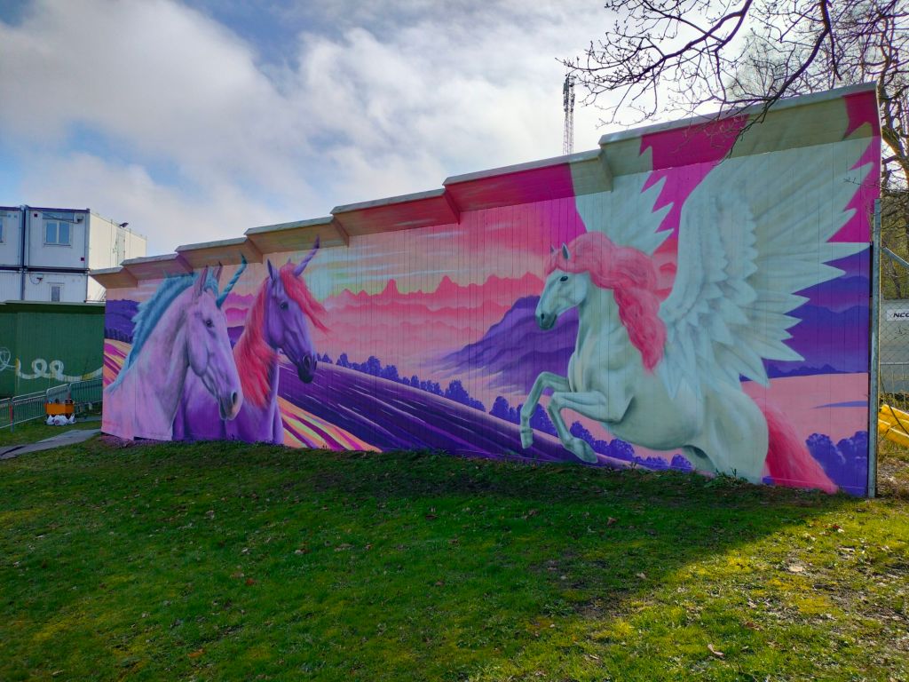 Till denna muralen har mina två döttrar (6 och 4 år) önskat att jag skall måla en vägg med enhörningar.