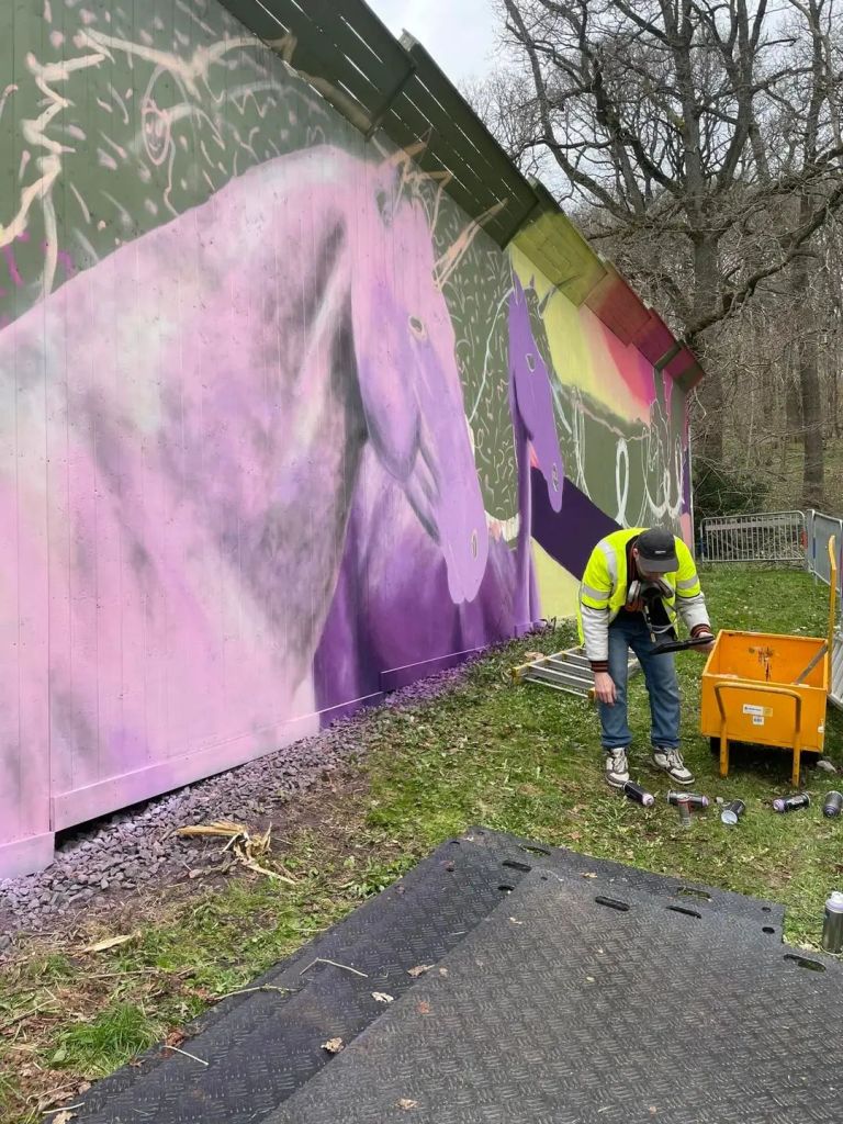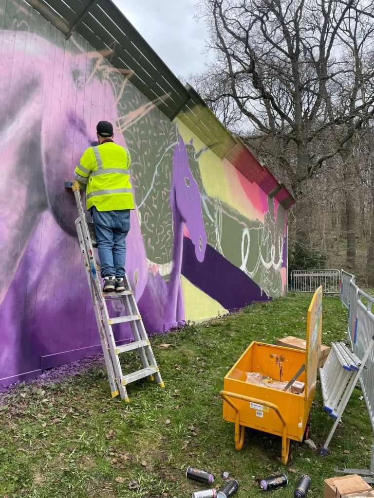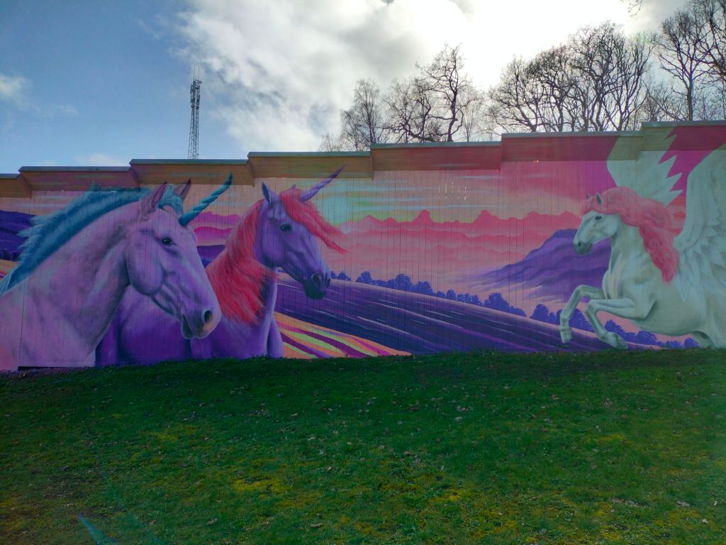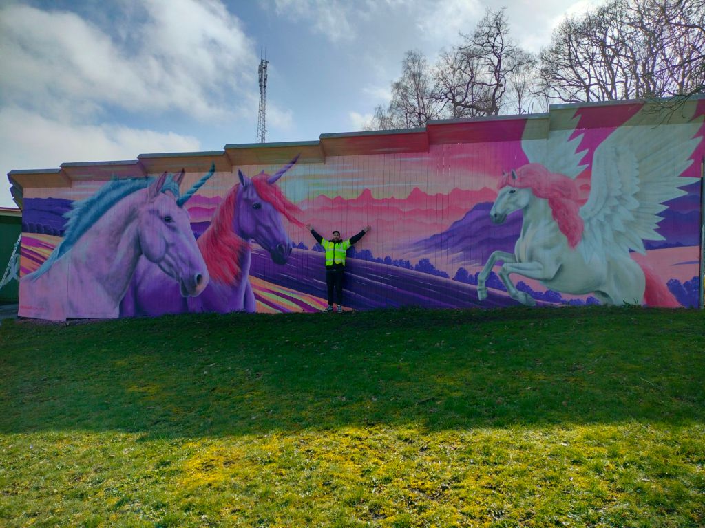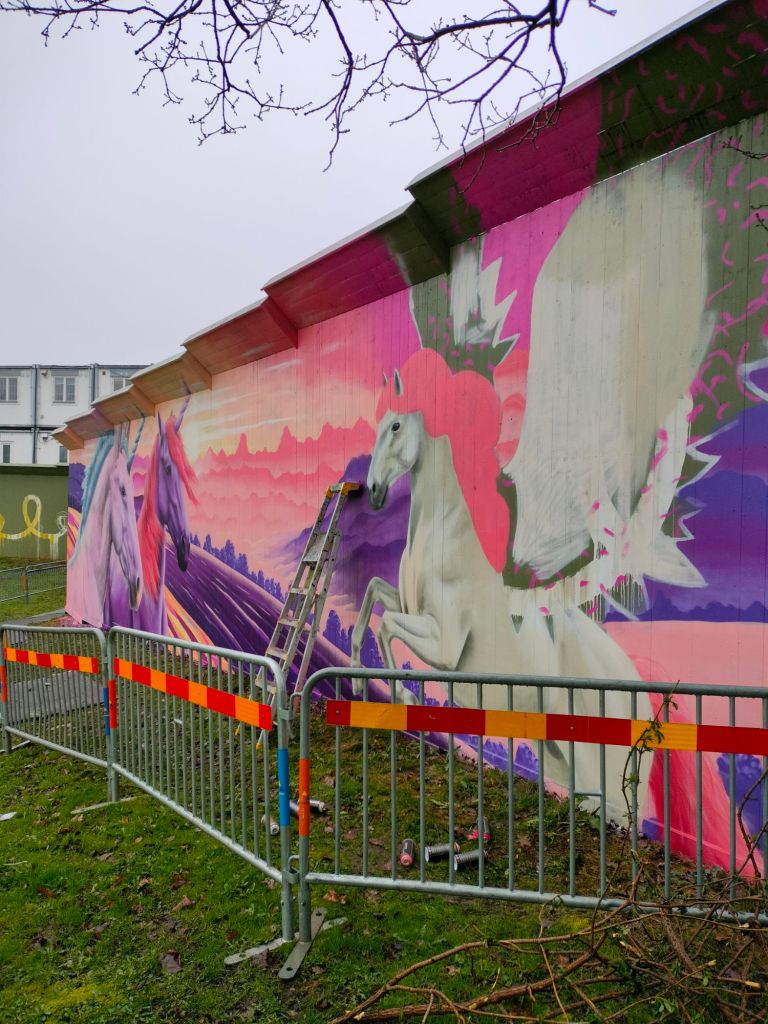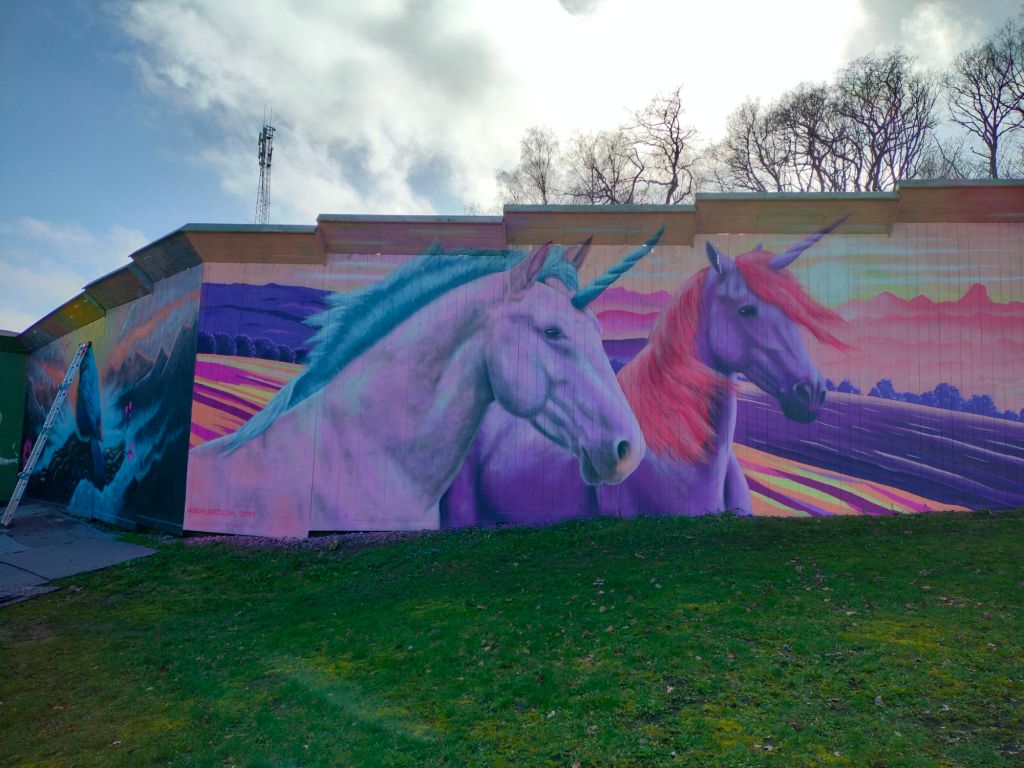 Till denna muralen har mina två döttrar (6 och 4 år) önskat att jag skall måla en vägg med enhörningar.