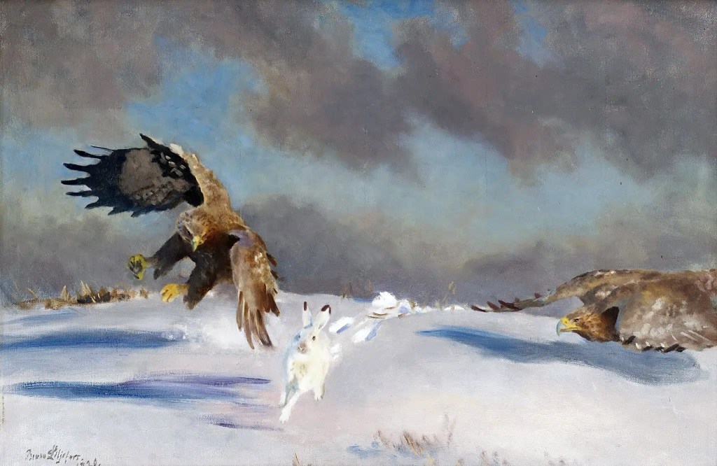 Fällande havsörnar mot vinterhare, Bruno Liljefors