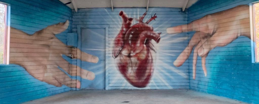 Detta verk har vuxit fram i flera etapper, från början målade jag endast ett hjärta i mitten av väggen.