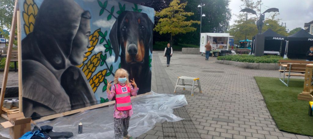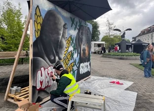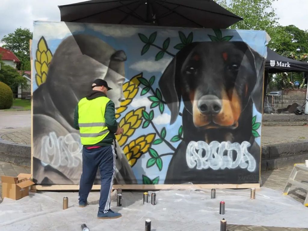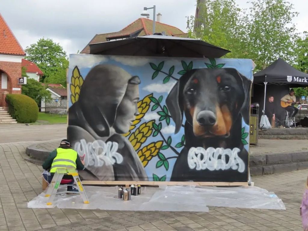 Jag blev ombedd att göra en målning som symboliserar båda platserna. Mark symboliseras av statyn ”Vävaren” och Apolda av en dobbermann.