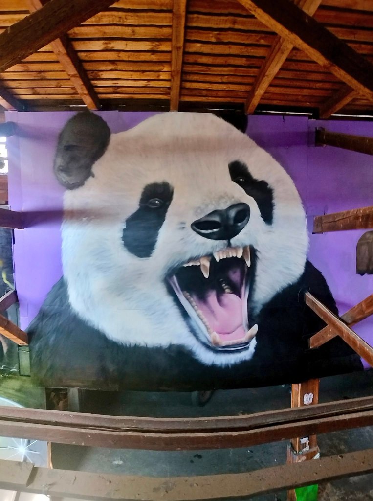 En panda som leker med ett godståg.
