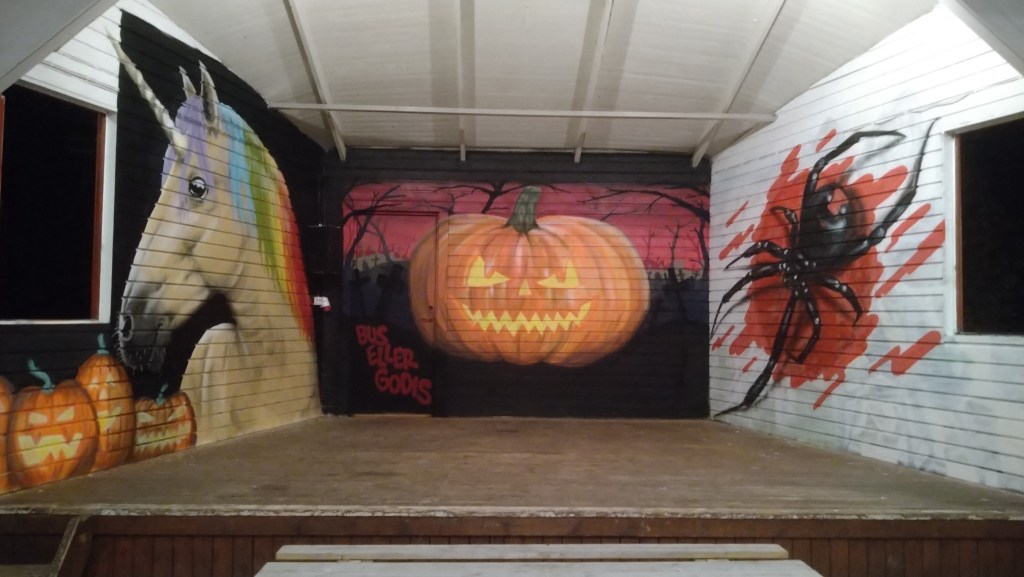 Årets Halloween-spraymålning på Viljans Park är nu klar. En målning som fångar den skrämmande men festliga stämningen på denna tid av året. Målningen består av en stor orange pumpa och ett kranium från en puma, samt texten bus eller godis som gör väggen både läskig och intressant, allt på en röd bakgrund.