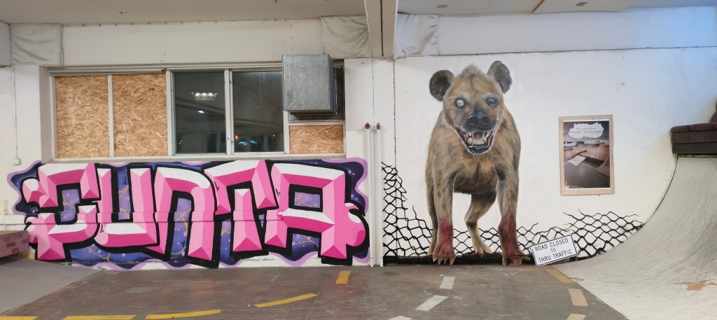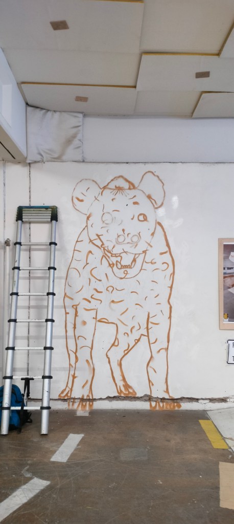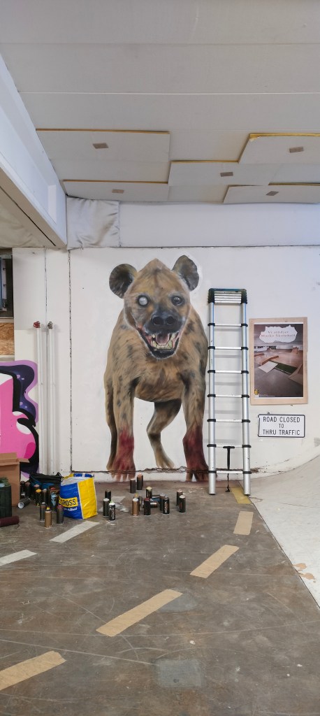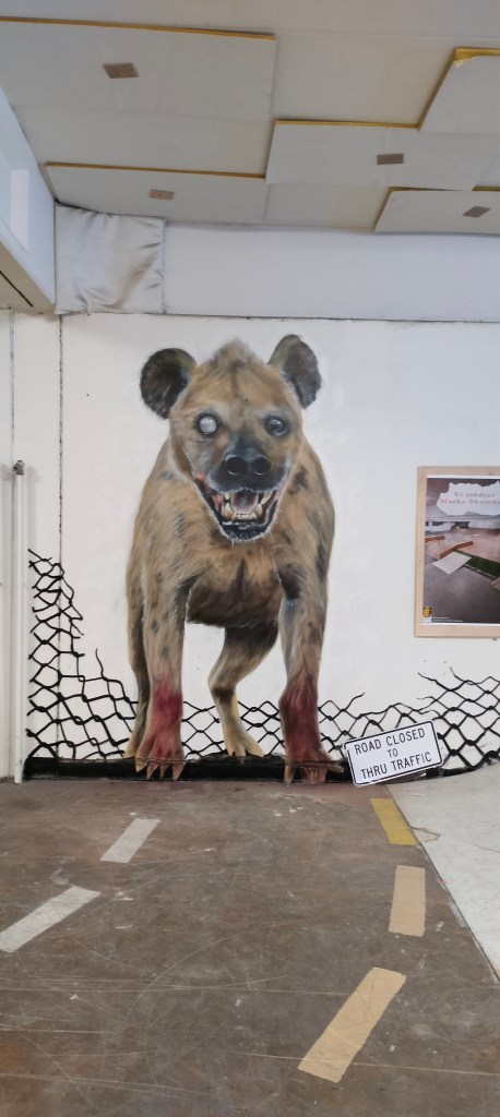 I skatehallen Decay i Skene har jag målat en ny väggmålning. Motivet blev en stor hyena som kommer fram från ett trasigt staket. Hyenan får symboliserar både styrka och överlevnad i en värld som ibland kan kännas hård.