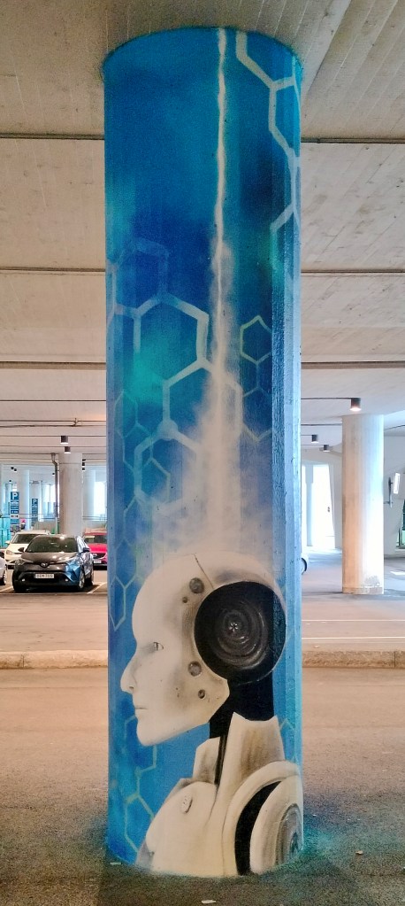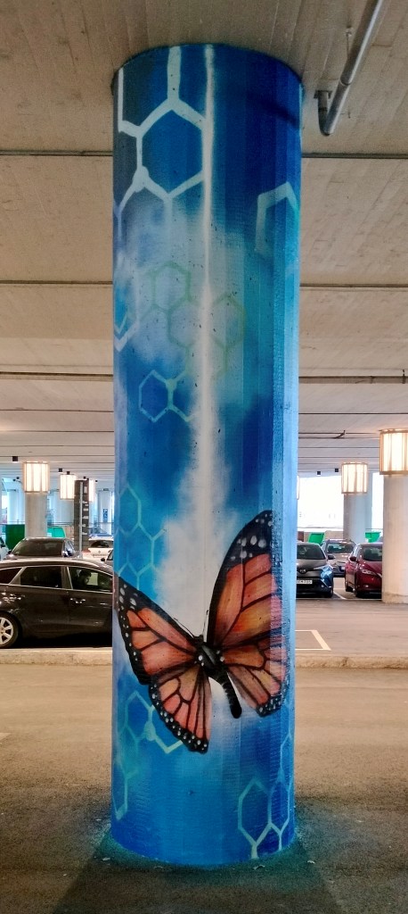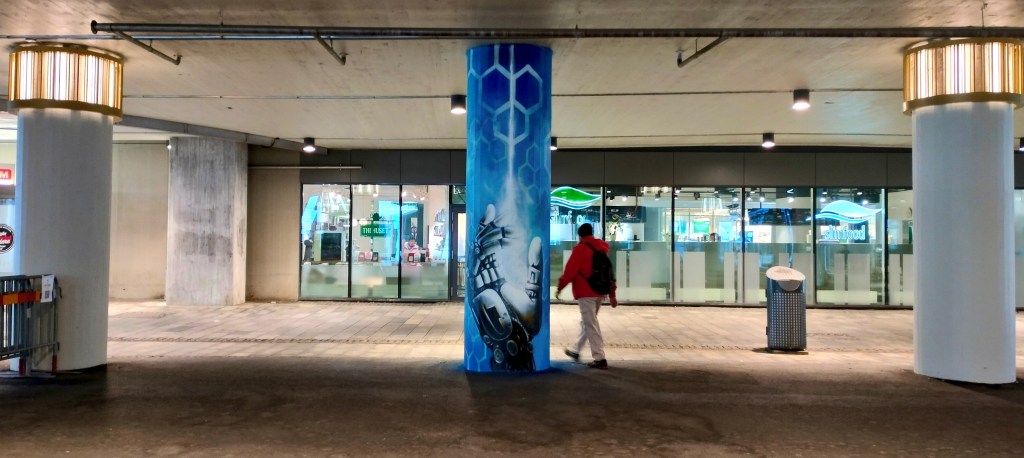 I mitten av Mölndal, vid Mölndals bro, precis utanför Mölndals Galleria har jag målat 6 stycken pelare.